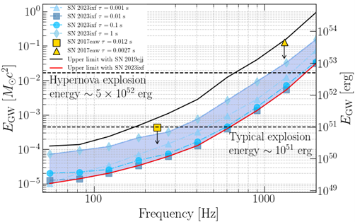 La région bleutée contient les signaux émis par des instabilités de différentes durées, entre quelques millisecondes et 1 seconde (les durées sont données en légende). Le carré et le triangle jaunes représentent l’énergie maximale que SN2017eaw aurait pu émettre sans être détectée en 2017. La ligne pointillée horizontale indique l’énergie typique émise sous forme électromagnétique par une supernova et par une hypernova.
